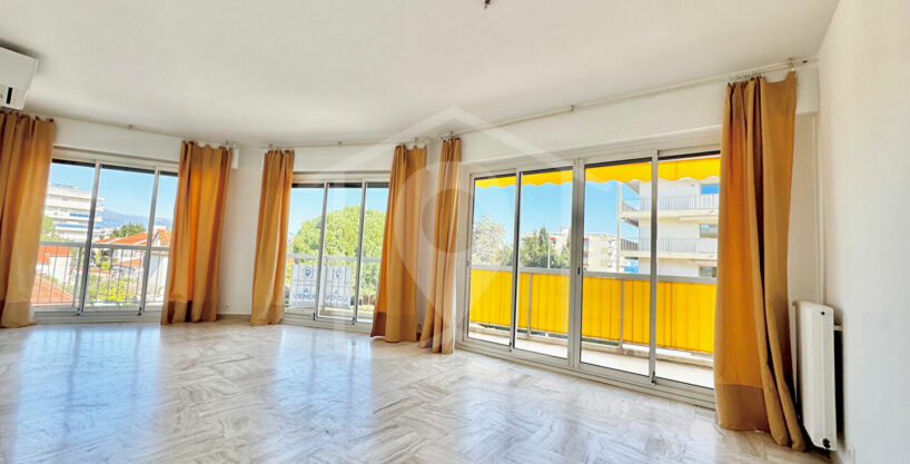 ANTIBES PLAGES Salis, 3/4 pièces de 75 m², vue mer au 2ème étage d’une résidence calme avec ascenseur, à 50 mètres de la plage de la Salis. Toutes les pièces disposent de portes-fenêtres donnant sur les balcons qui entourent l’appartement.
