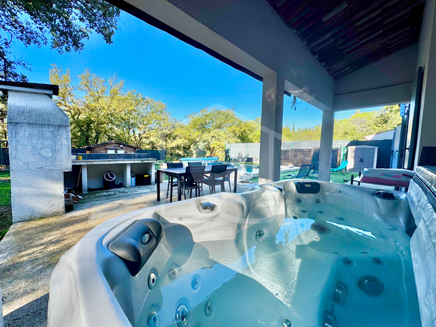 Le terrain est agrémenté d’une piscine, un jacuzzi, jeux enfants, cabanon, terrasse abritée.